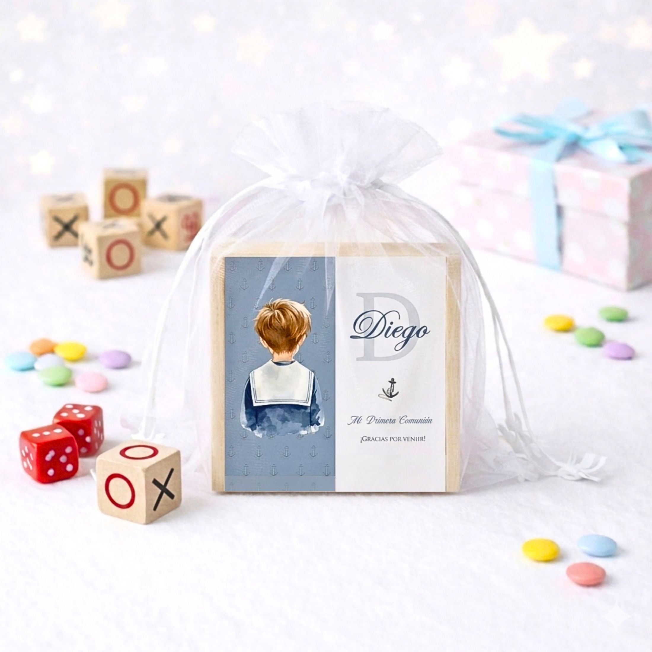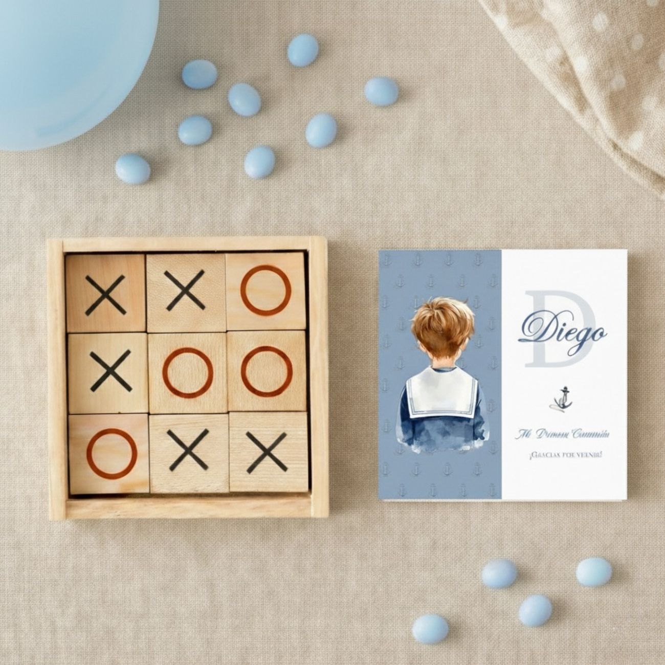 Este juego de tres en raya en caja de madera, con diseño de Comunión, es un detalle original pensado especialmente para sorprender a los niños o invitados más pequeños del evento.