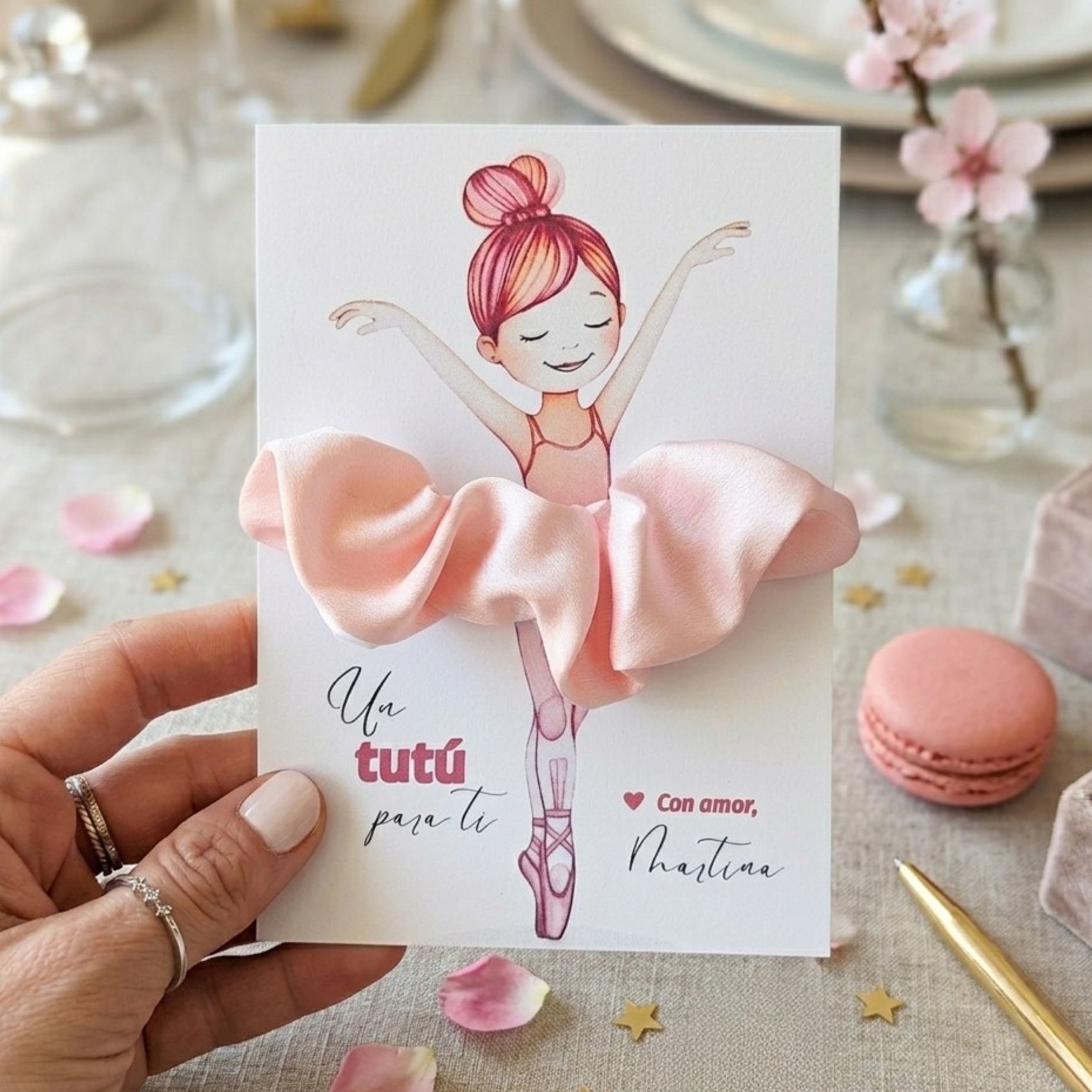 La tarjeta personalizada con coleteto a forma de tutú de ballet es un detalle para las niñas invitadas a eventos como comuniones o cumpleaños… ideles también en bodas, bautizos, baby shower o celebraciones espciales.
