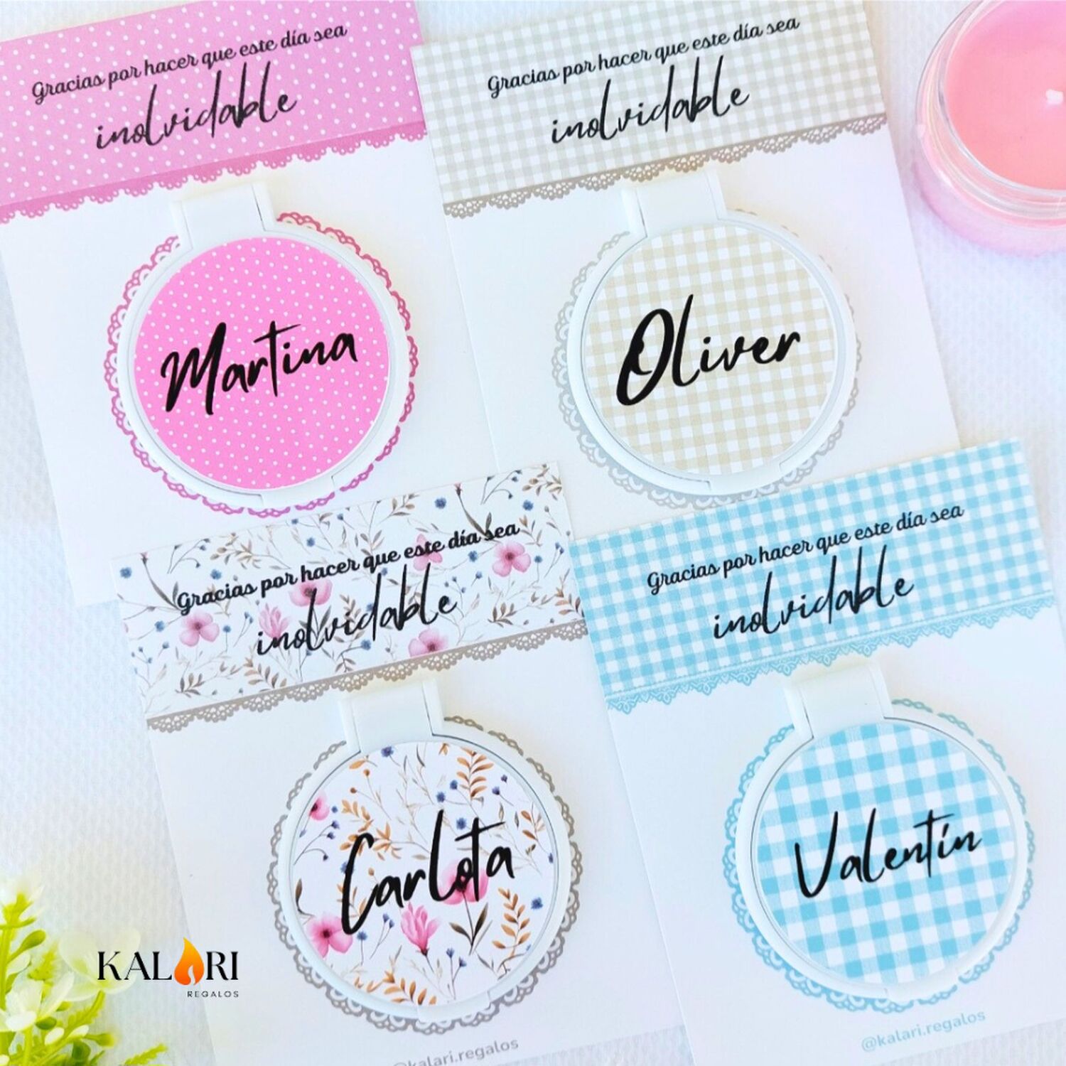 Ideales para bodas, comuniones y bautizos, cada espejito se presenta sobre una tarjeta personalizada con diseños suaves y cuidados, en armonía con la estética del evento. Su tamaño compacto los convierte en un complemento perfecto para llevar en el bolso o tener siempre a mano.