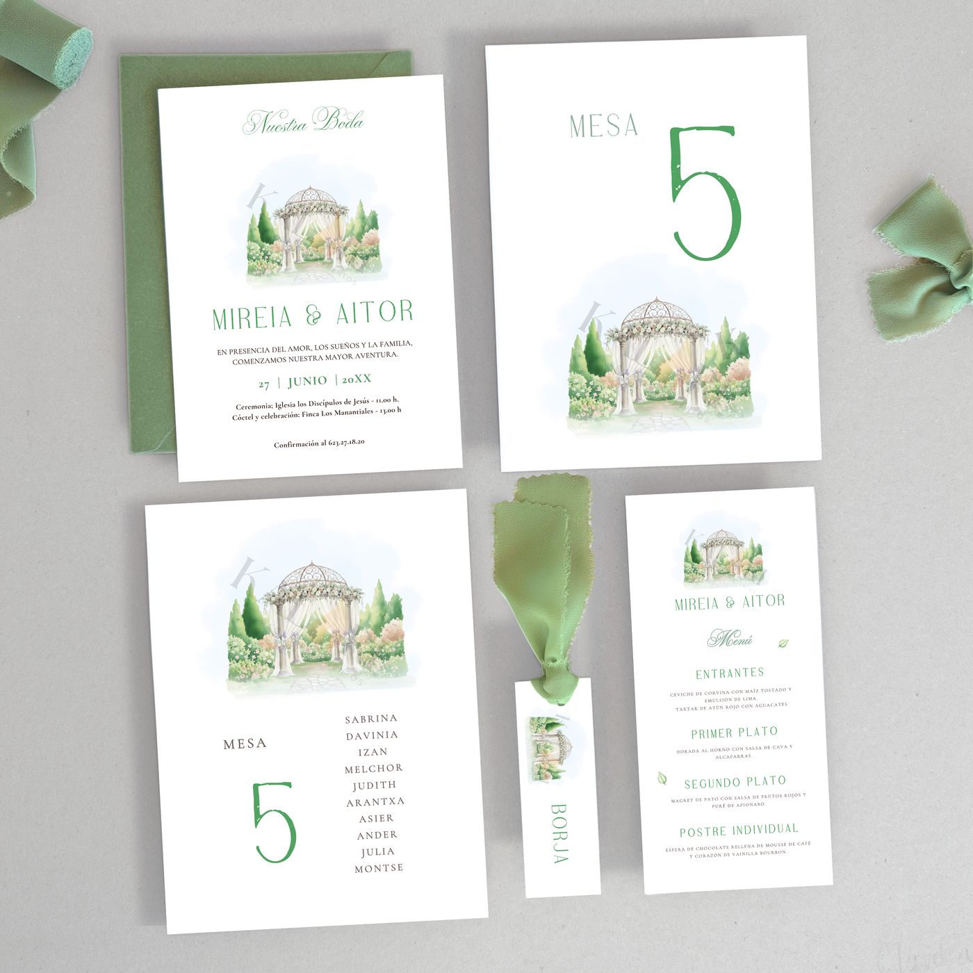 La invitación Jardín puede combinarse con otros elementos de papelería a juego, como seating plan, números de mesa, minutas o cartelería, manteniendo una estética coherente en todo el evento.