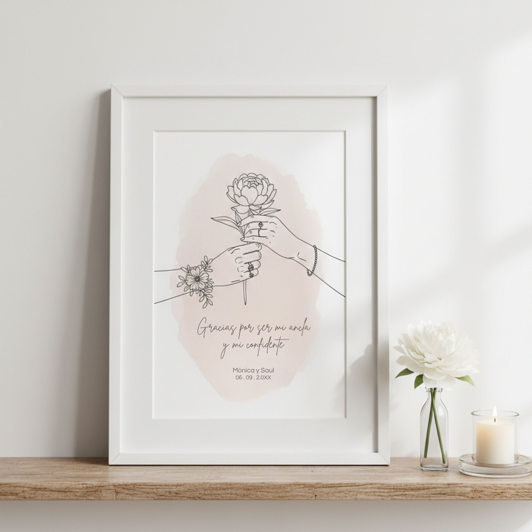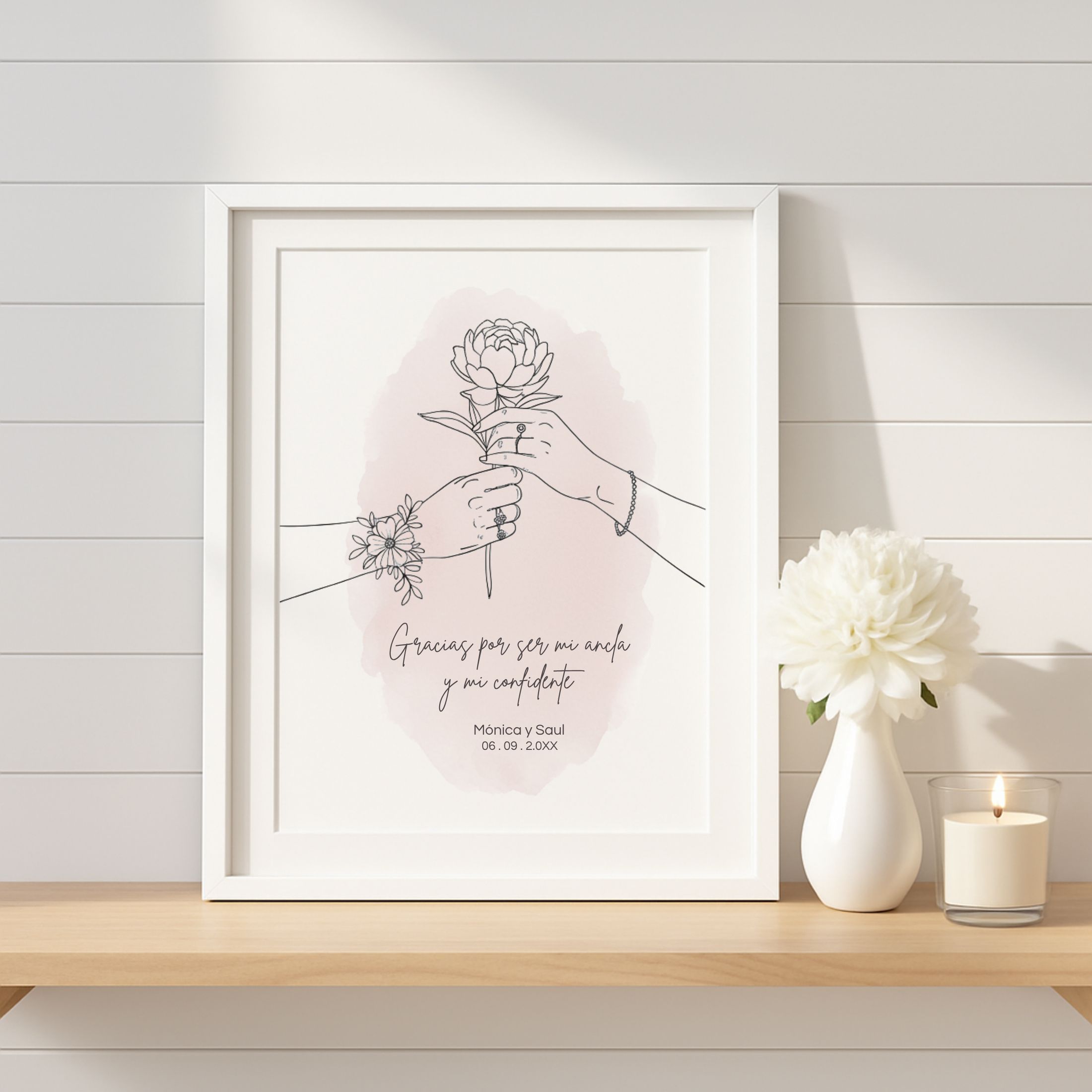Dos manos que se unen para sostener una flor es un símbolo de amistad, complicidad y cariño. Ideal para regalar a damas de honor, amigas o testigos, como recuerdo de un vínculo que florece y se fortalece en los momentos más importantes.