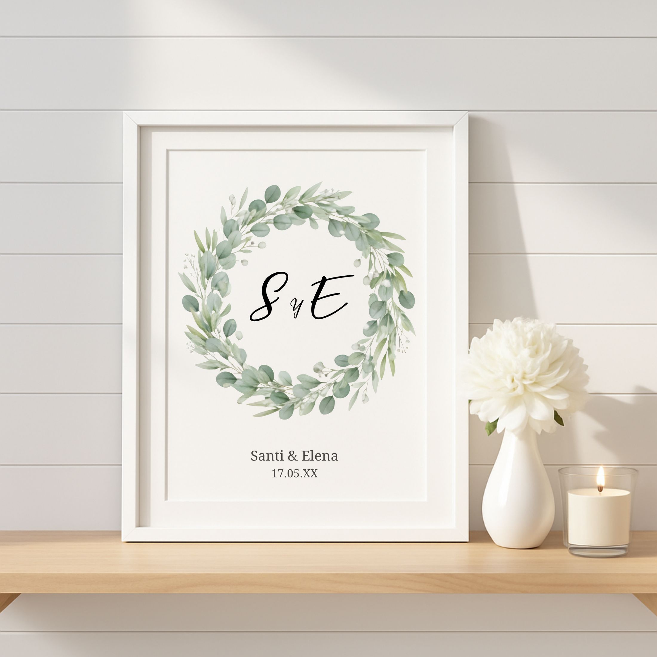 La imagen de las iniciales de los novios en una guirnalda, acompañada de sus nombres y la fecha del enlace, es un detalle elegante y emocional perfecto para agradecer a padres y familiares más cercanos su papel en vuestras vidas y en ese gran día.