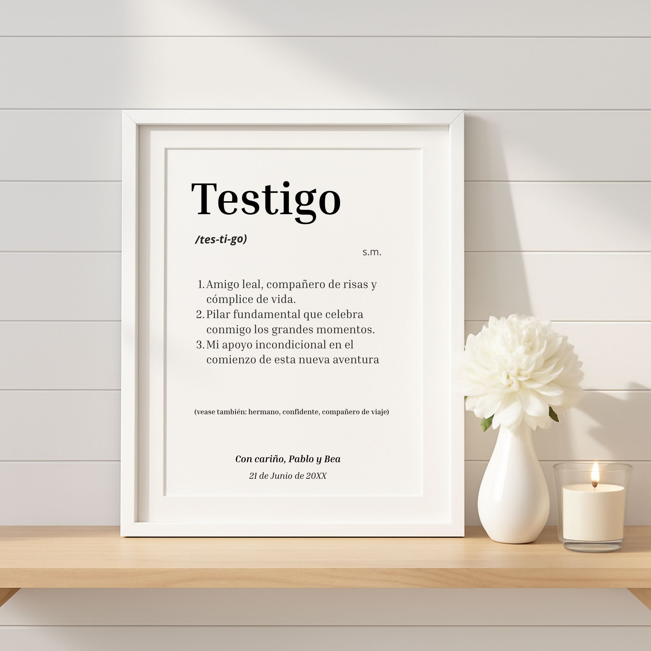 Una definición inspirada en los diccionarios más bonitos: sencilla, directa y cargada de significado. Creada para regalar a los testigos de boda -especialmente a ellos- como muestra de gratitud por acompañar y ser parte esencial del «sí, quiero».