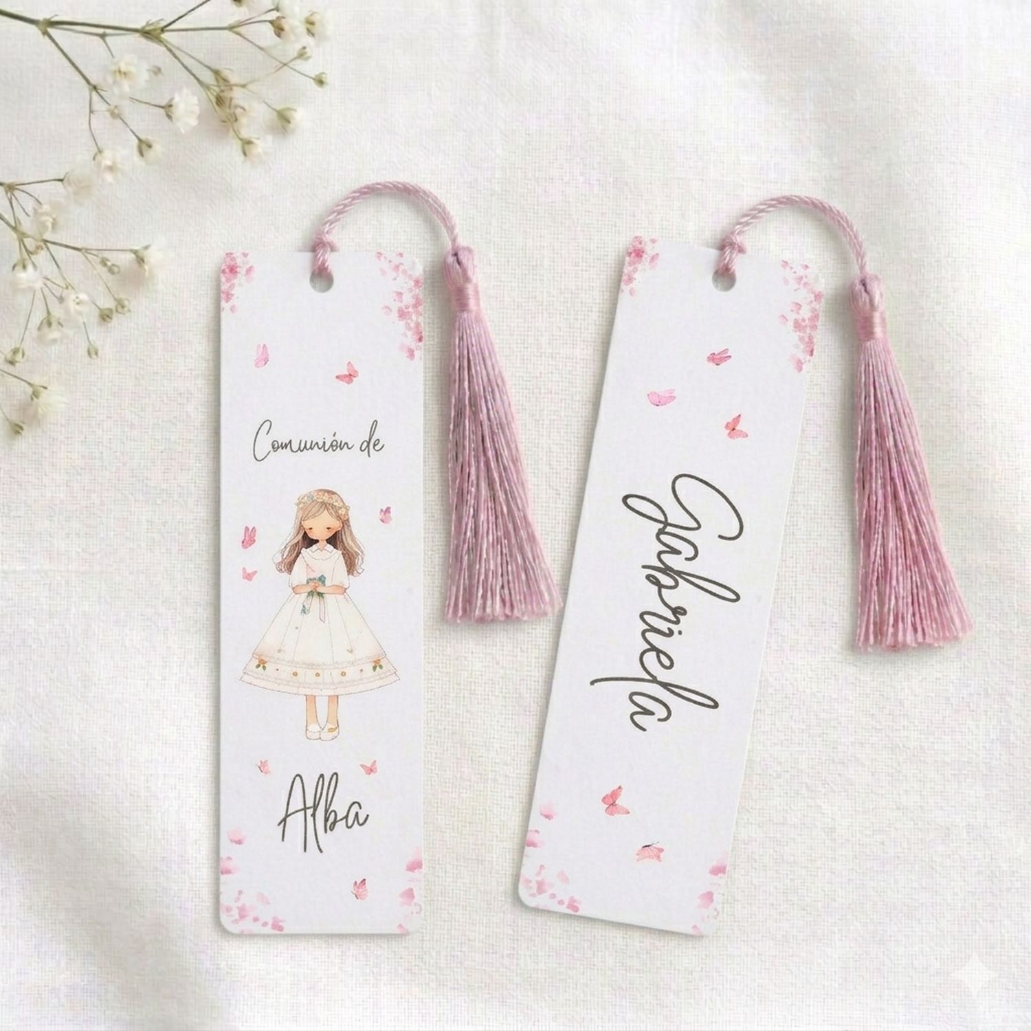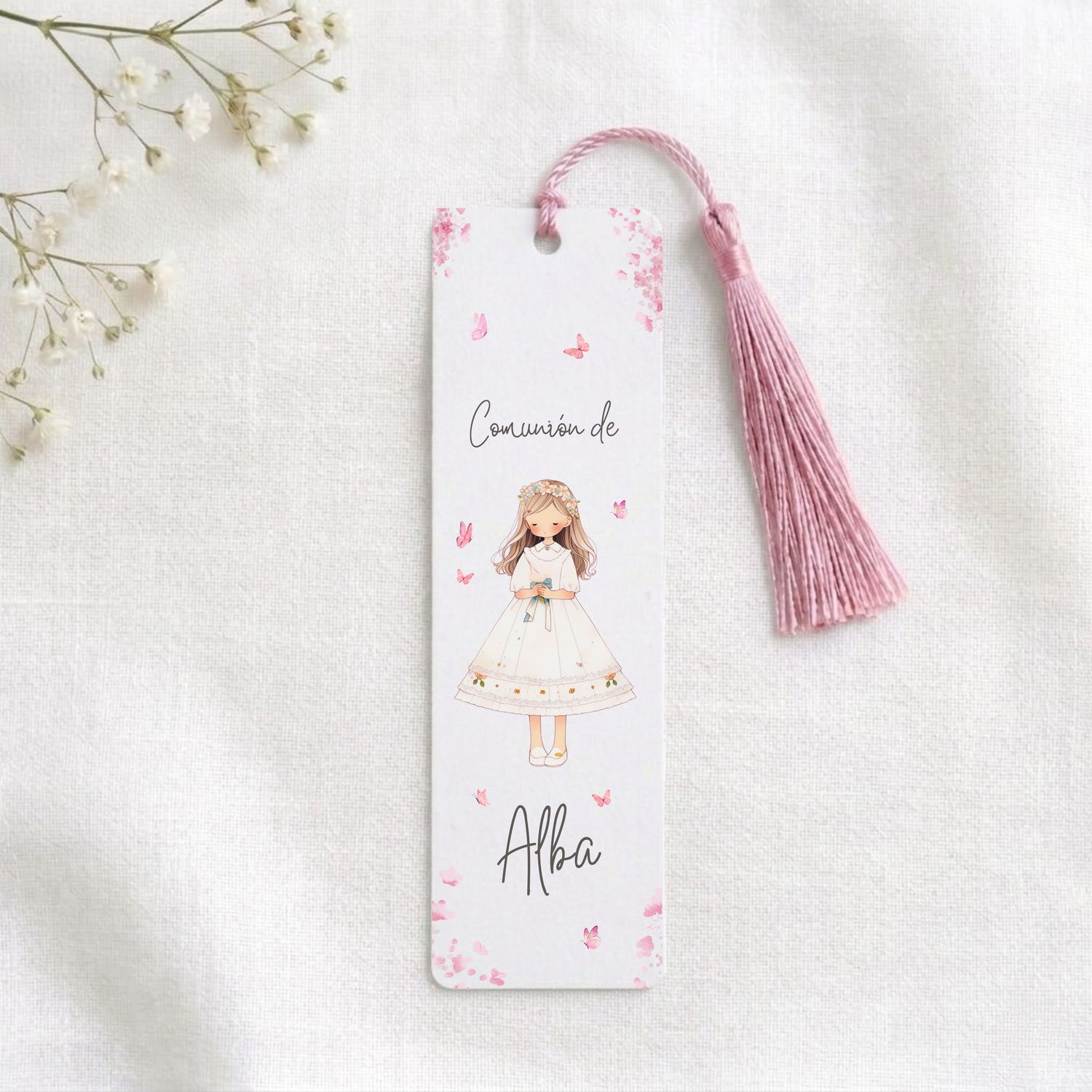 Este marcapáginas personalizado «ROSE» es un detalle elegante y delicado pensado para sorprender a los invitados en un día tan especial como la Primera Comunión de una niña. Su diseño ilustrado en tonos rosa transmite dulzura, calma y armonía, convirtiéndolo en un recuerdo cuidado que acompañará a familiares y amigos mucho después de la celebración.