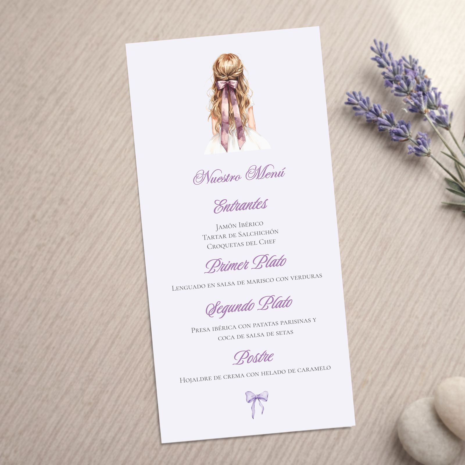 La minuta de menú de comunión modelo Carlota es una tarjeta que informa a los invitados de los platos que se servirán durante la celebración y, al mismo tiempo, aporta un toque decorativo a la mesa. Además, ayuda a mantenerla ordenada y cuidada, en armonía con el resto de la papelería del evento.