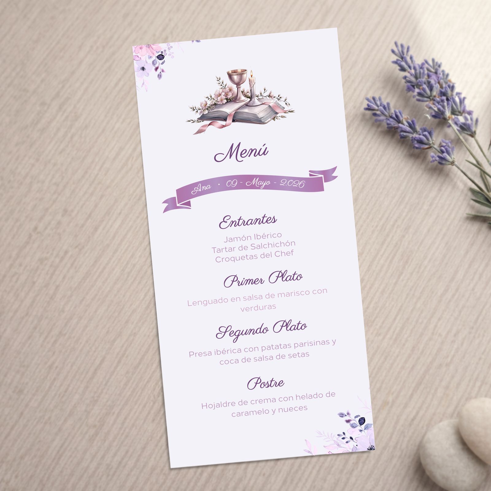 El modelo Cáliz, por su diseño y colores malva y morado, es idóneo para comuniones de niña y encaja perfectamente en celebraciones familiares donde se cuida cada detalle.