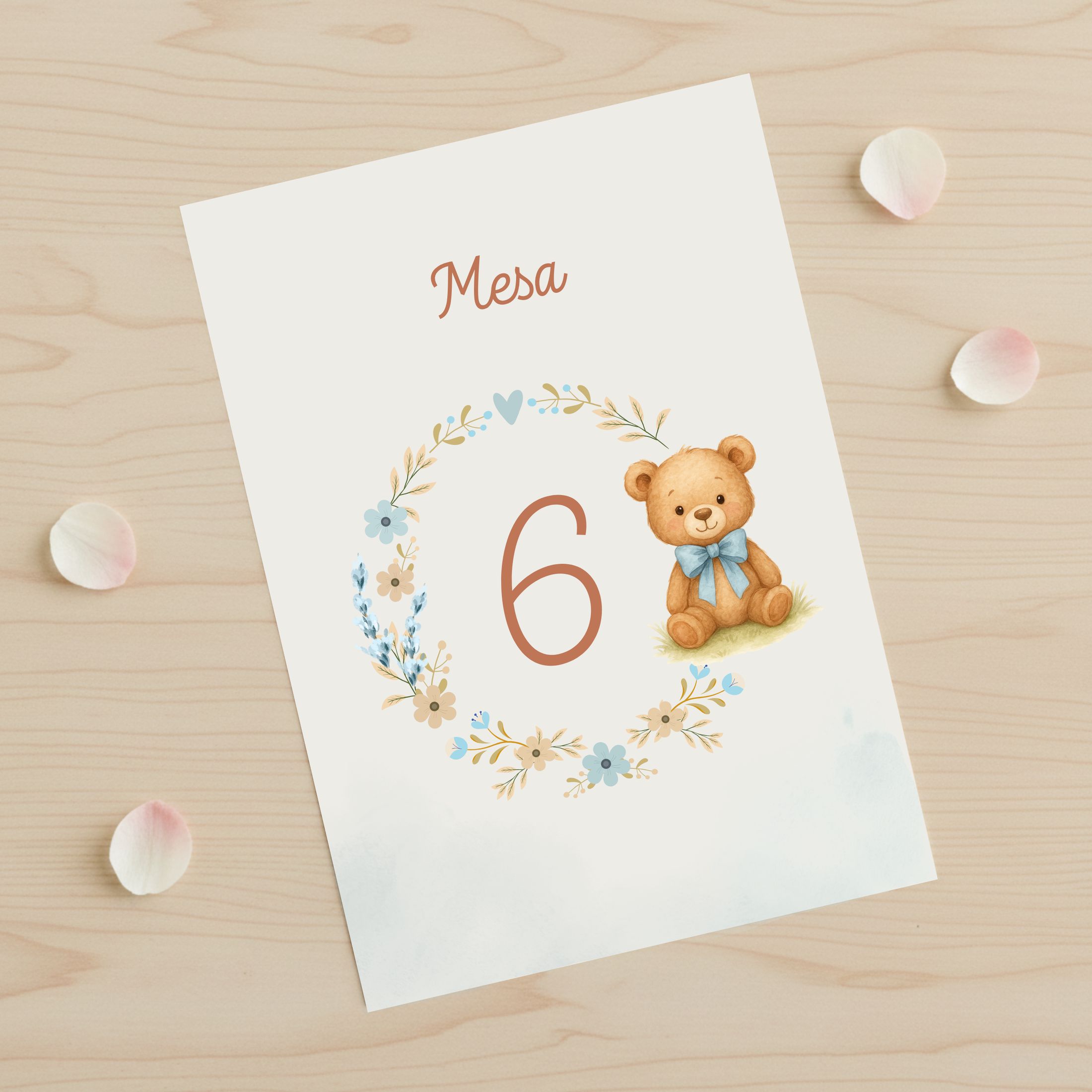Este número de mesa infantil con ilustración de osito está pensado para celebraciones de bautizo y eventos familiares con un enfoque dulce y delicado. Su diseño transmite ternura y cuidado en cada detalle, ayudando a organizar las mesas de forma clara sin perder la estética infantil del conjunto. Es una pieza que acompaña al resto de la papelería del evento, aportando coherencia visual y creando una decoración cuidada y armoniosa para un día tan especial.