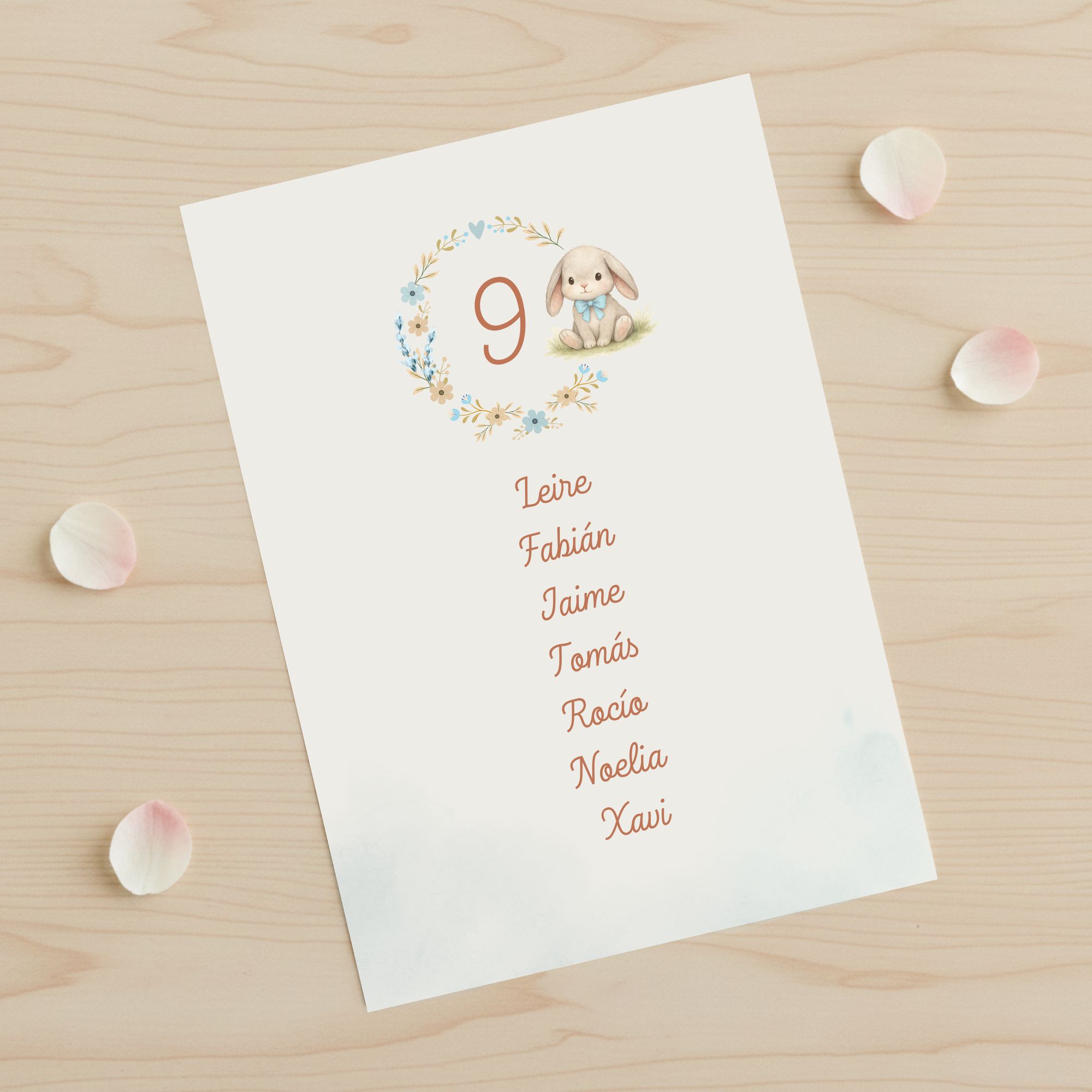 El seating plan con ilustración animal, modelo Conejito, para bautizo, se personaliza con los nombres de los invitados y la distribución de mesas, adaptándose al número de asistentes.