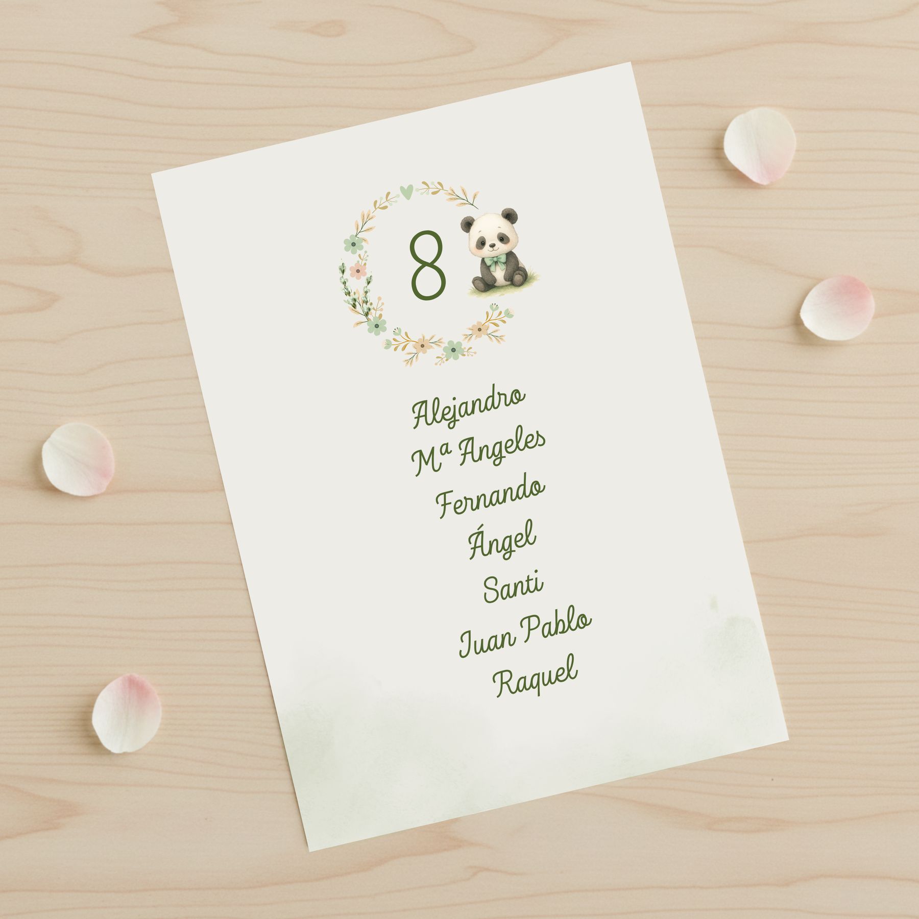 El seating plan de animales modelo Panda es una pieza de papelería diseñada para organizar de forma elegante a los invitados de cualquier bautizo o celebración infantil., aportando al mismo tiempo un hermoso toque decorativo. La ilustración en tonos verdes desprende delicadeza y calidez, creando un ambiente cuidado desde el primer momento.