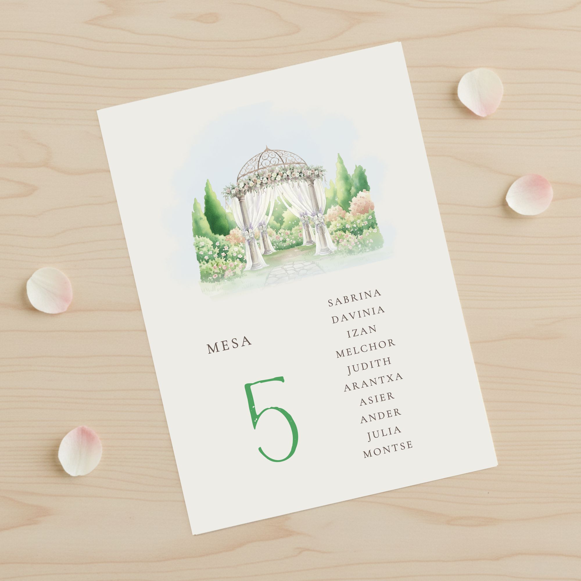 El seating plan modelo Jardín es una pieza de papelería estilo botánico diseñada para organizar de forma elegante a los invitados de cualquier boda o celebración especial, aportando al mismo tiempo un hermoso toque decorativo. Su diseño se caracteriza por la frescura y colores de un hermoso jardín con una cúpula central. El conjunto aporta armonía, romanticismo y equilibrio visual.
