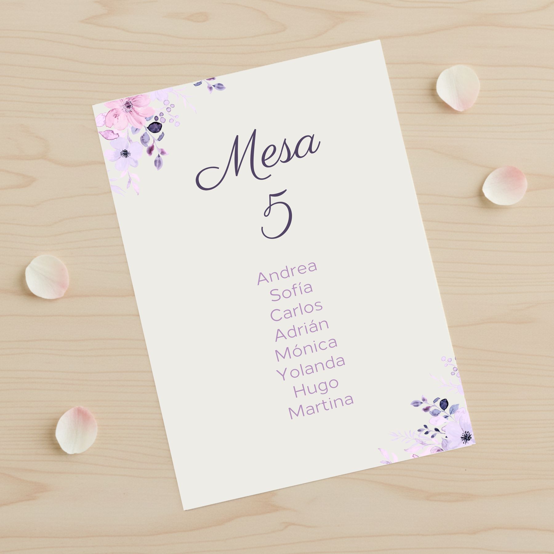 Este seating plan de comunión personalizado presenta un diseño elegante y delicado, con una composición floral en tonos malva y morado situada en dos de sus esquinas. La distribución del texto es limpia y equilibrada, con el número de mesa destacado en tamaño grande y toda la información alineada al centro, facilitando la lectura y aportando armonía visual.