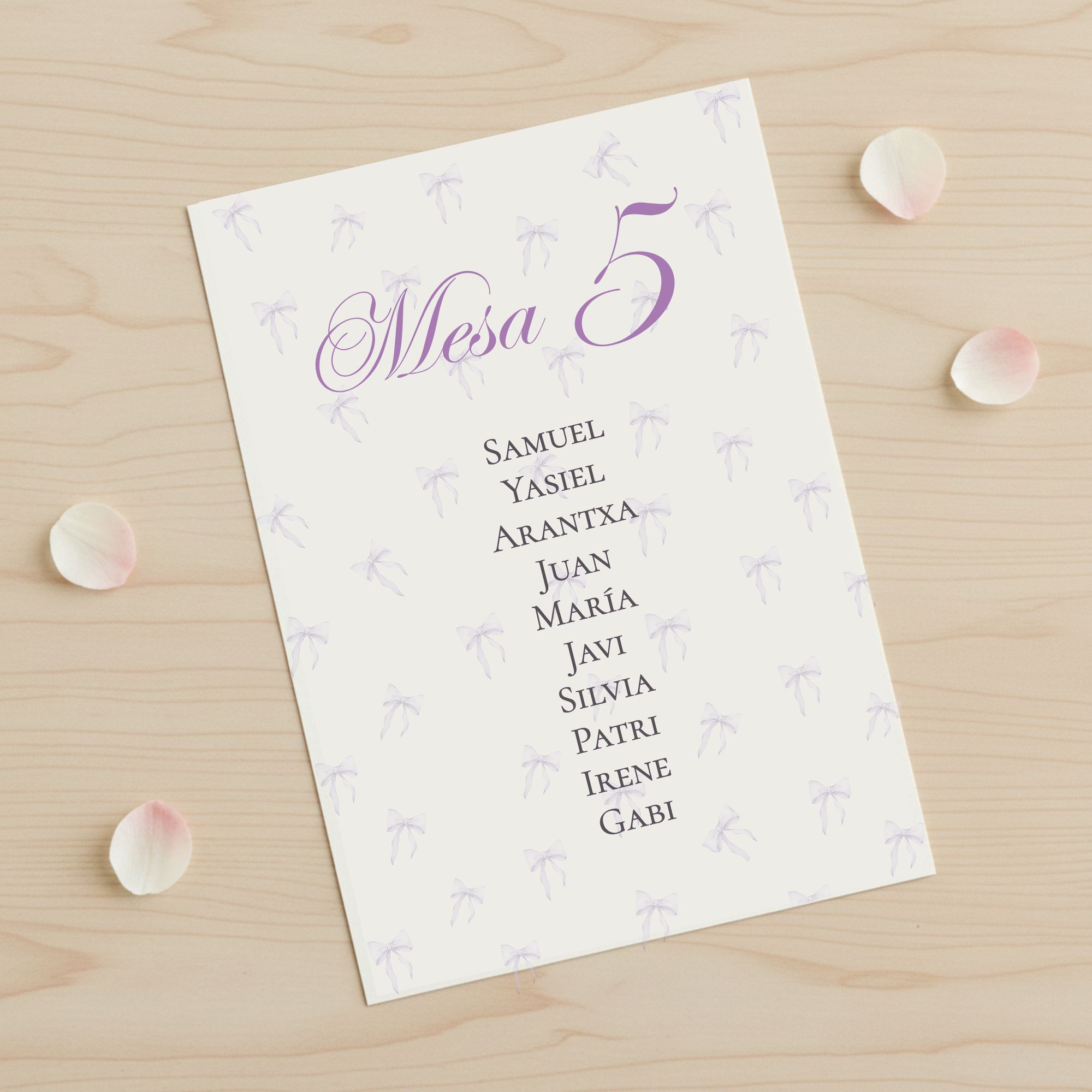 Textos centrados y número de mesa del seating plan de comunión modelo Camila