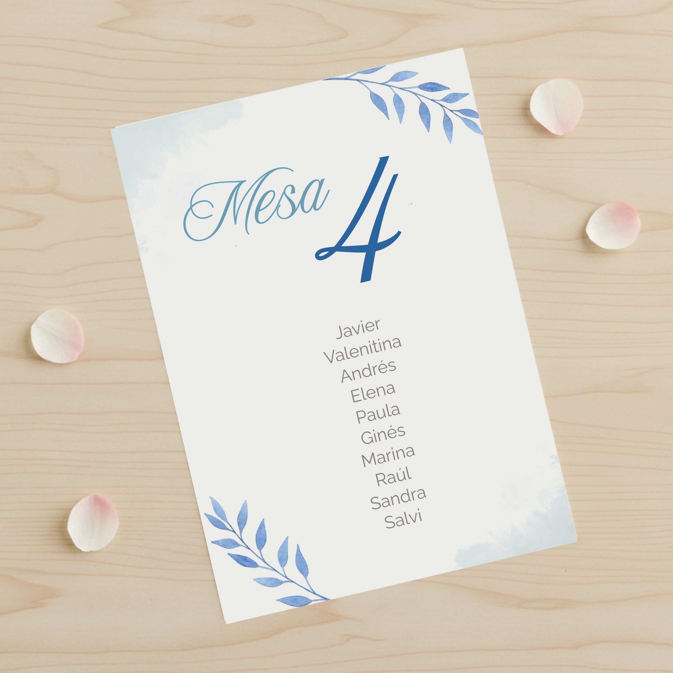 El seating plan de comunión azul modelo Gonzalo es una propuesta delicada y elegante, pensada para organizar a los invitados de forma clara y estética en celebraciones de Primera Comunión. Su composición clásica y floral, la distribución del texto limpia y equilibrada y el número de mesa destacado en tamaño grande, facilitan la lectura y aportan armonía visual.