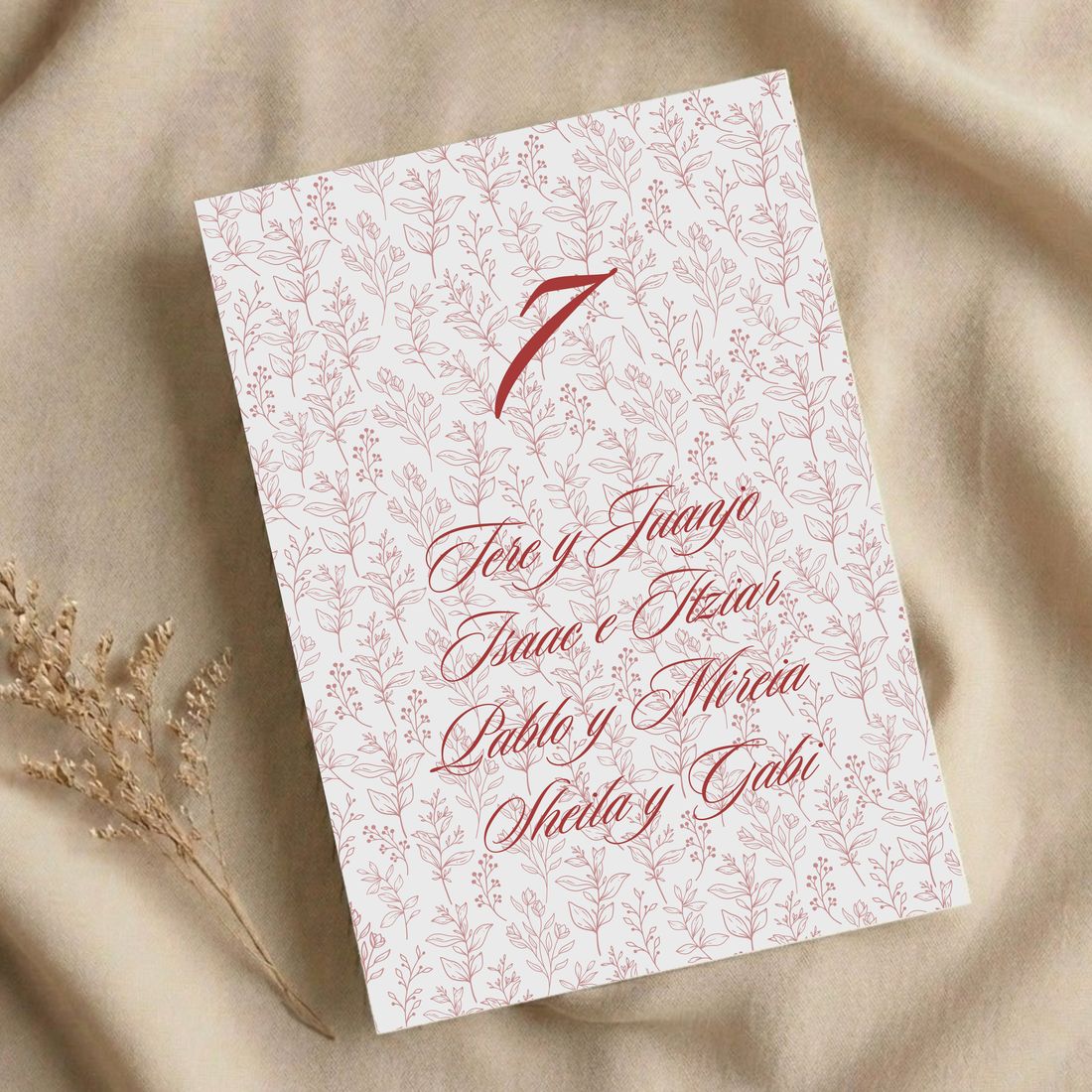 Este modelo combina una composición cuidada con una tipografía muy elegante y una distribución ordenada de los nombres y mesas. Su estilo clásico y delicado, lo convierte en una opción ideal para bodas, aniversarios, celebraciones especiales o eventos donde se busca una estética romántica y atemporal.