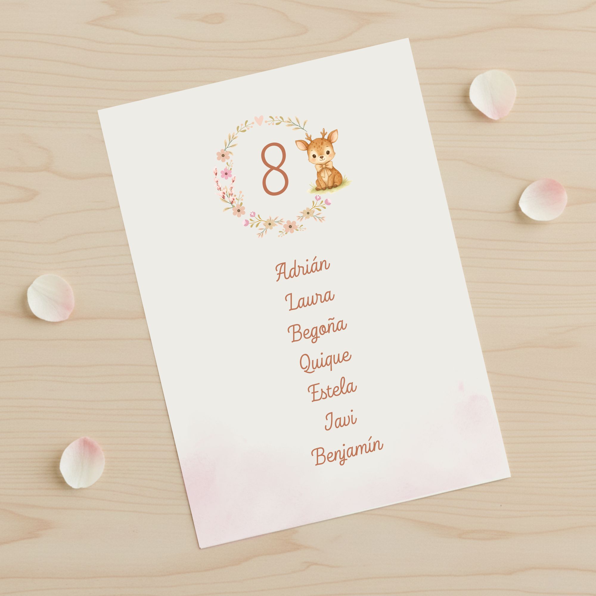 El seating plan modelo Ciervo es una pieza de papelería diseñada para organizar de forma elegante a los invitados de cualquier bautizo o celebración infantil., aportando al mismo tiempo un hermoso toque decorativo. La ilustración en tonos rosas desprende delicadeza y calidez, creando un ambiente cuidado desde el primer momento.