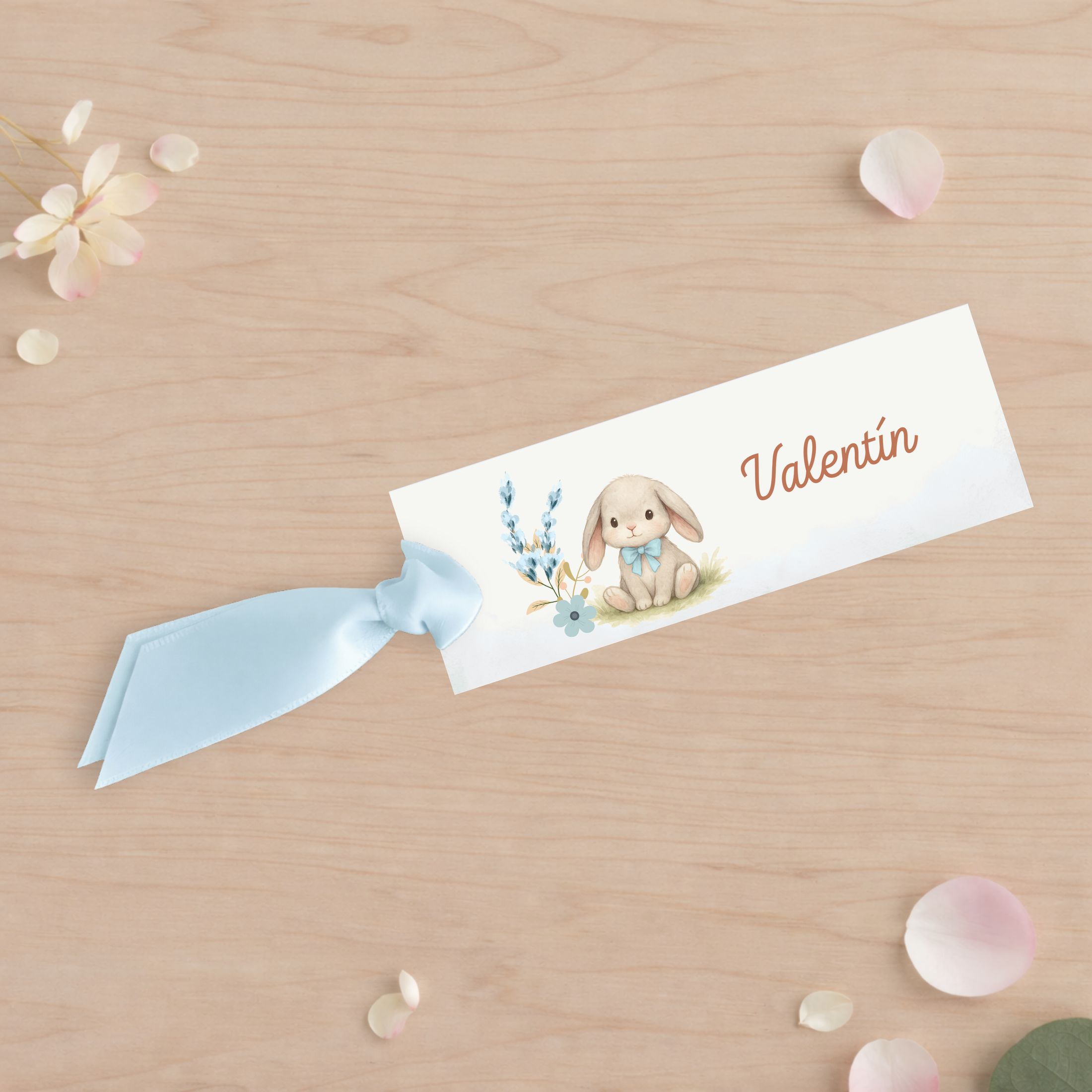La tarjeta de asiento Modelo Conejito, con ilustración animal, está pensada para organizar a los invitados de forma clara y delicada en celebraciones de bautizo y eventos infantiles. Su diseño cuidado, con colores suaves y armoniosos, la convierte en un elemento funcional y decorativo dentro de la mesa.