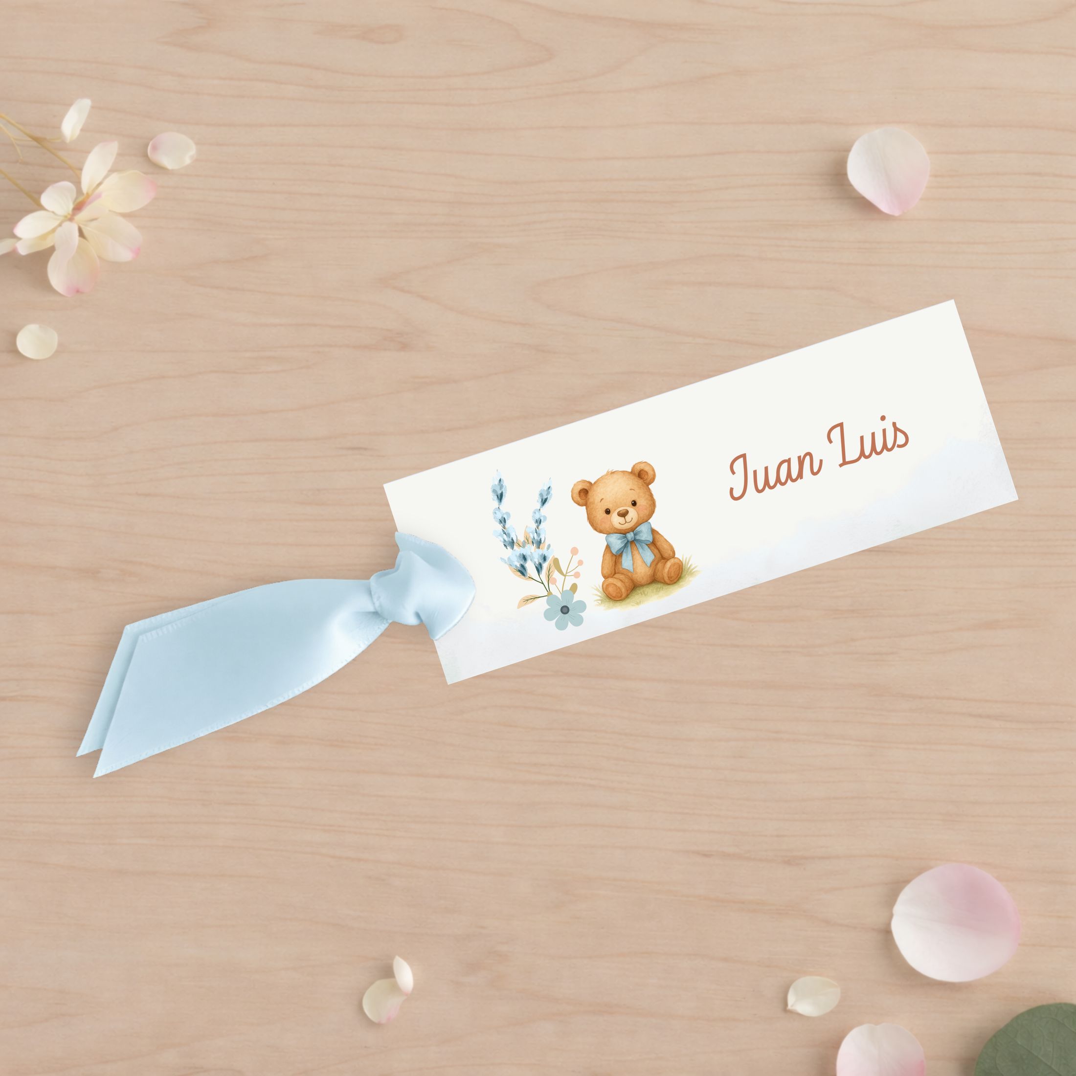 La tarjeta de asiento Modelo Osito, con ilustración, está pensada para organizar a los invitados de forma clara y delicada en celebraciones de bautizo y eventos infantiles. Su diseño cuidado, con colores suaves y armoniosos, la convierte en un elemento funcional y decorativo dentro de la mesa.