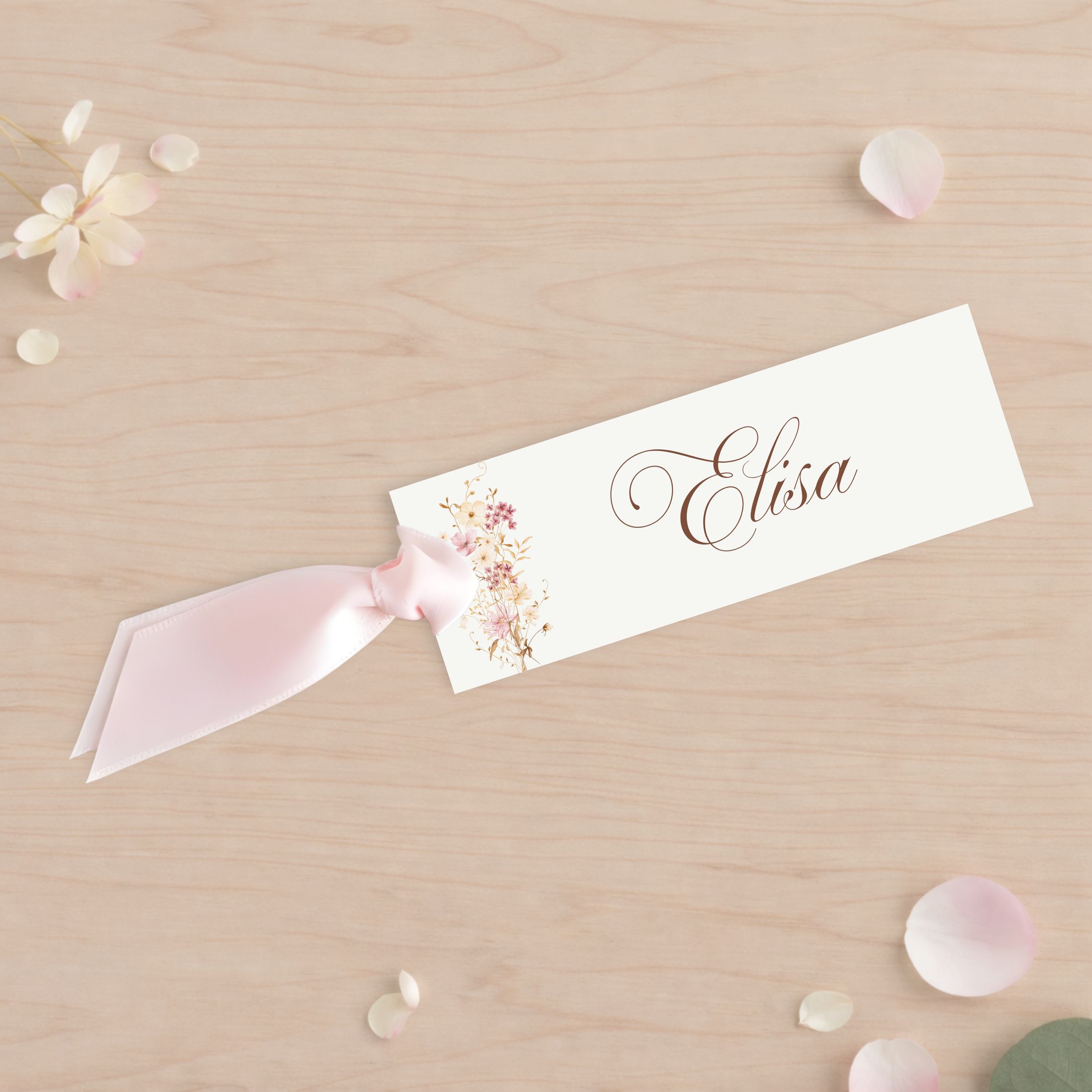 Cada tarjeta se personaliza con el nombre del invitado y puede coordinarse con el seating plan, los números de mesa y el resto de la papelería a juego. Su diseño elegante y atemporal encaja en bodas, aniversarios, comidas especiales y eventos familiares.