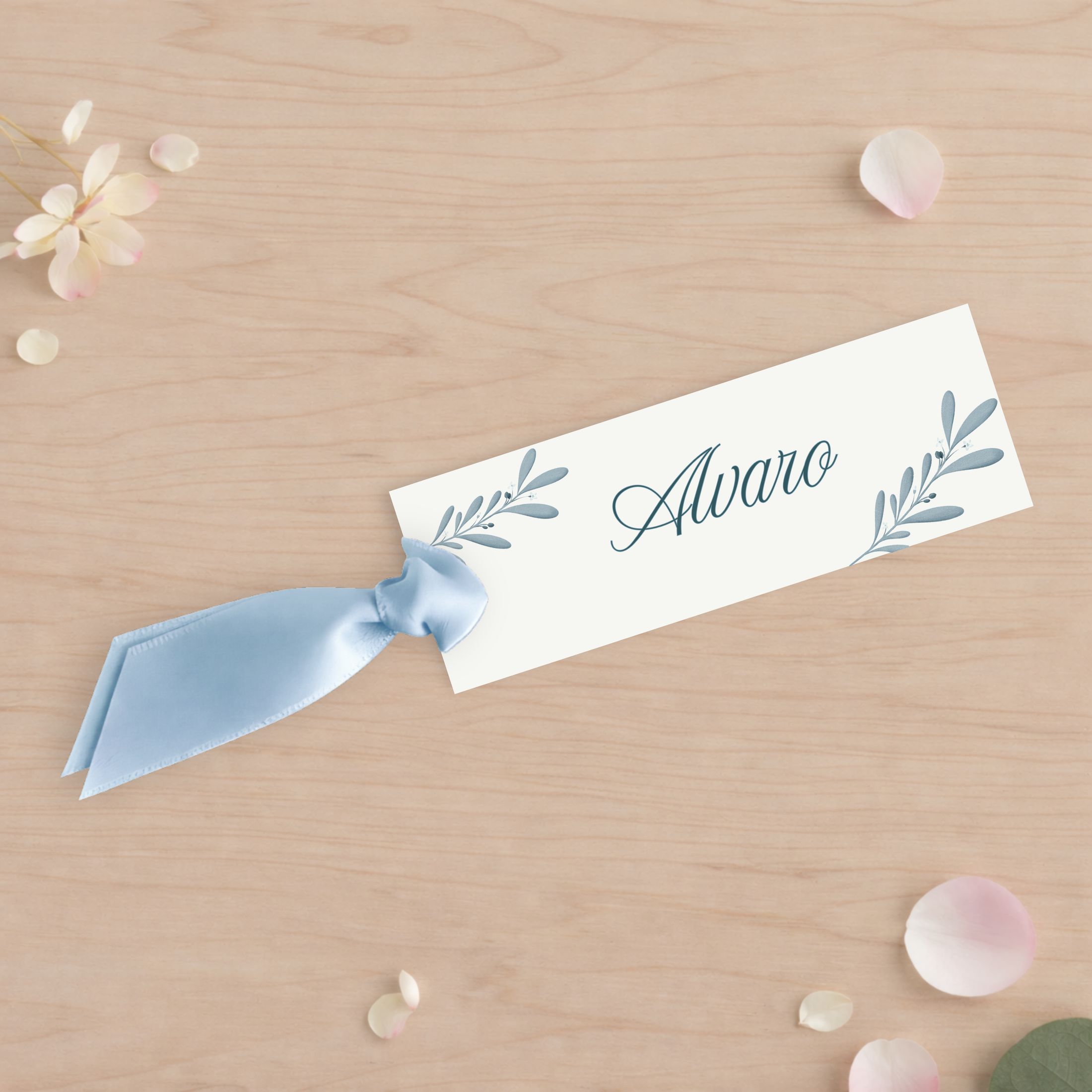 La tarjeta de asiento de comunión modelo Gonzalo, de estilo mediterráneo y color azul, es un complemento elegante para organizar a los invitados en este día tan especial. Su diseño equilibrado con ramas de olivo permite identificar cada lugar en la mesa de forma clara, aportando al mismo tiempo un valor decorativo que completa la papelería del evento.
