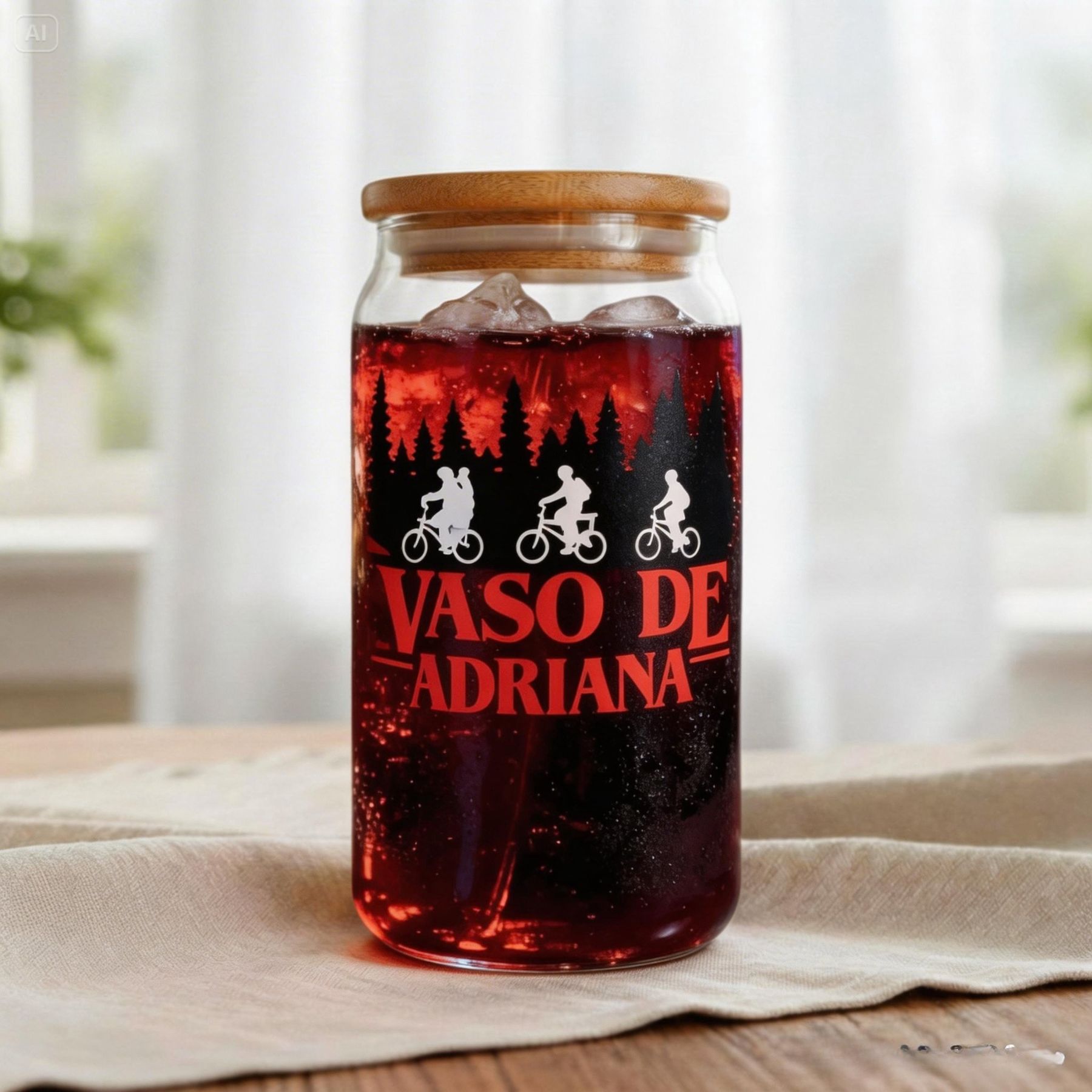 Este vaso de cristal personalizado con nombre, modelo Mundo inverso, destaca por su diseño actual y lleno de carácter, inspirado en aventuras y mundos misteriosos que conectan con el público más fan. Una pieza ideal para sorprender con un regalo original, práctico y con mucha personalidad.